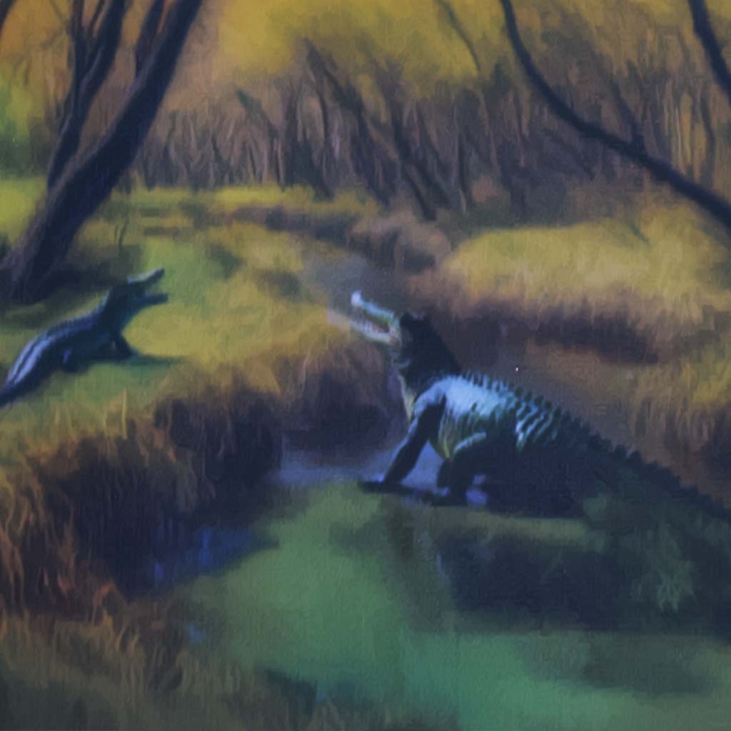 This canvas captures the harrowing moment when three friends, lost in the swamps of Australia, face the ultimate test of survival. Surrounded by ferocious crocodiles with razor-sharp teeth and ravenous hunger, their only escape lies beyond the walls of a remote cabin owned by a reclusive local. Every step is a gamble. Every decision is a matter of life or death.
